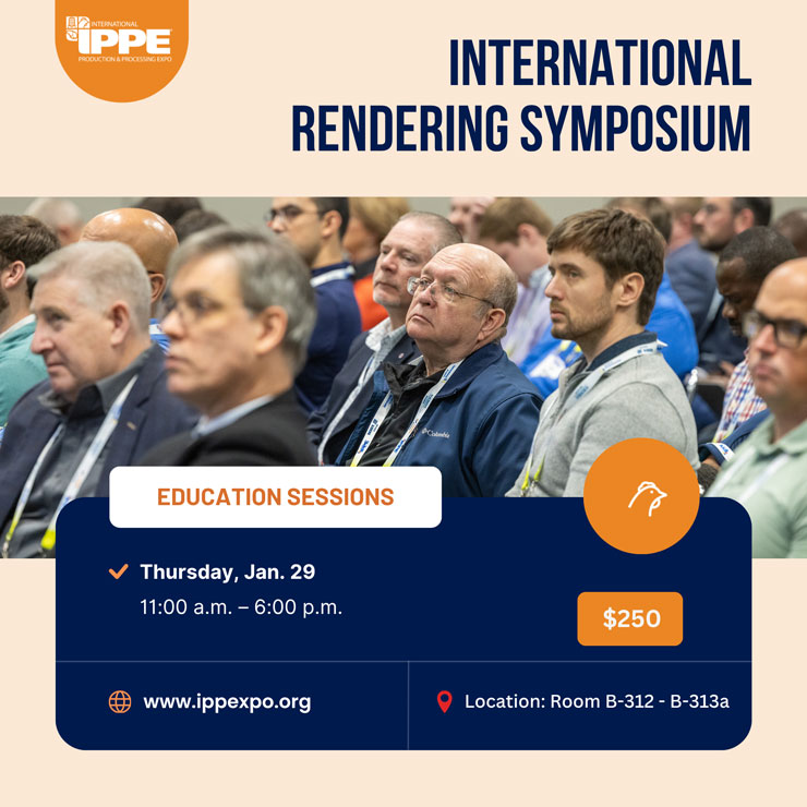 The rendering industry plays a critical role in supporting animal agriculture through sustainability, innovation and responsible resource use, yet its value is often underrecognized in broader food and feed discussions. The International Rendering Symposium, held in conjunction with the 2026 International Production & Processing Expo (IPPE) in Atlanta, will focus on strengthening science-based communication across animal agriculture, optimizing rendered ingredients for a sustainable feed future and addressing the risks and resilience challenges facing the industry. Hosted by the North American Renderers Association (NARA) and U.S. Poultry & Egg Association (USPOULTRY), the symposium will take place from 11 a.m. to 6 p.m. on Thursday, Jan. 29, in room B-312 / B-313a. Registration is $250.